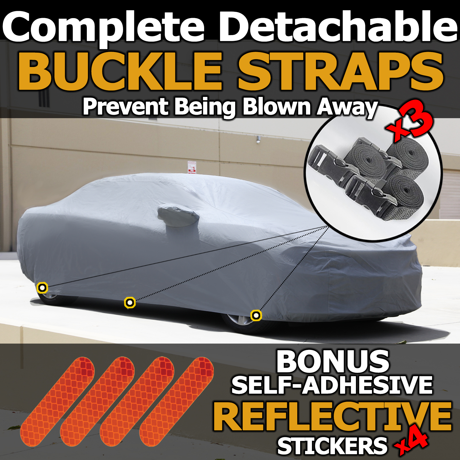 Wind-Proof Design: 3 Detachable straps and Elasticized hem and three fixed buckles help cover against to strong wind,protect your car cover in heavy wind from blowing off.