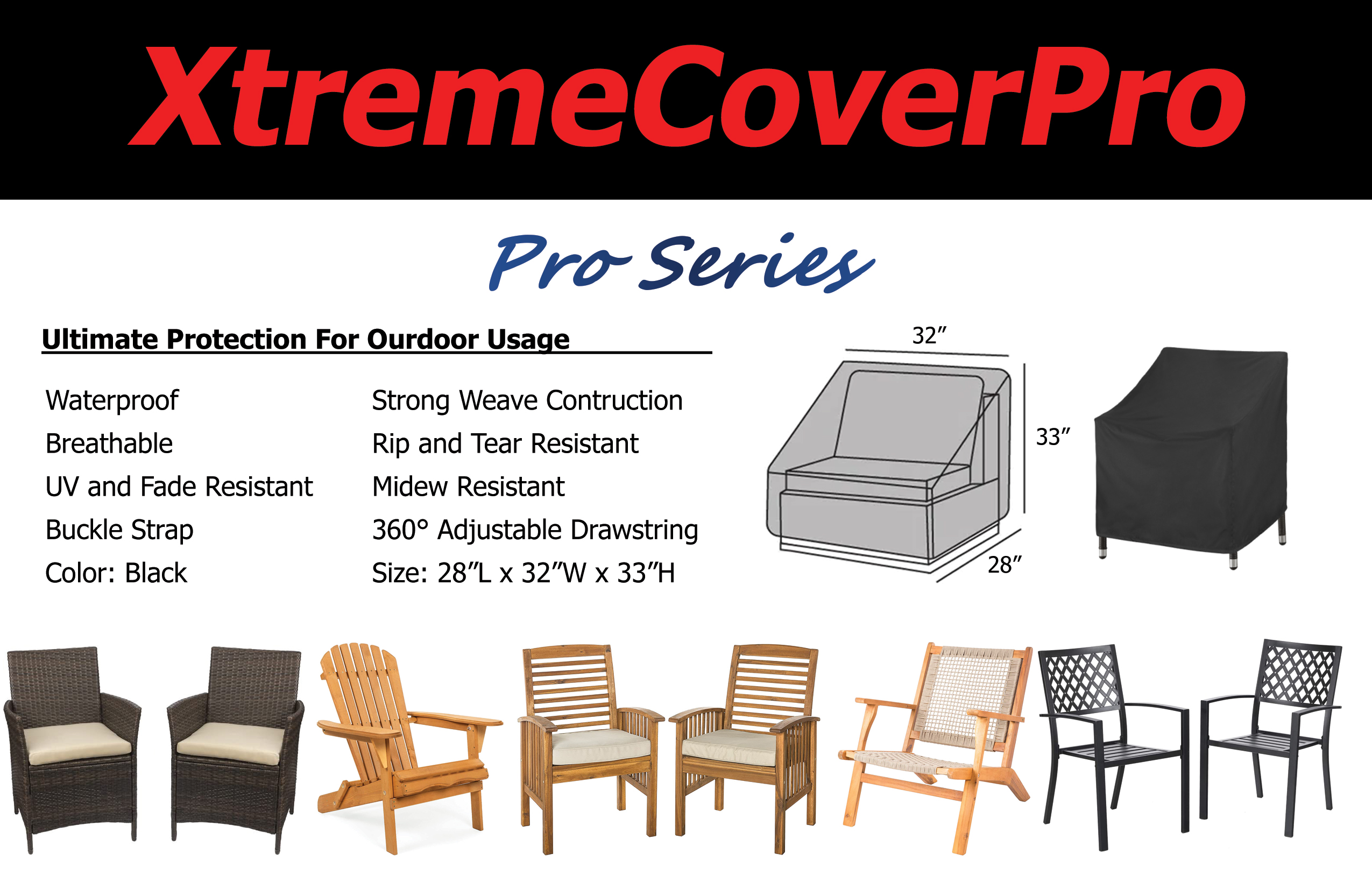A Custom-Like Fit: XtremeCoverPro Pro Series Patio Chair Covers are suitable for outdoor chairs of various shapes and types. There are multiple sizes available for you to choose from. This cover fits up to 28″ W x 32″ D x 33″H. Please measure your chair dimensions carefully before purchasing, and we recommend that you choose the cover that is 1-2 inches larger than your chair.